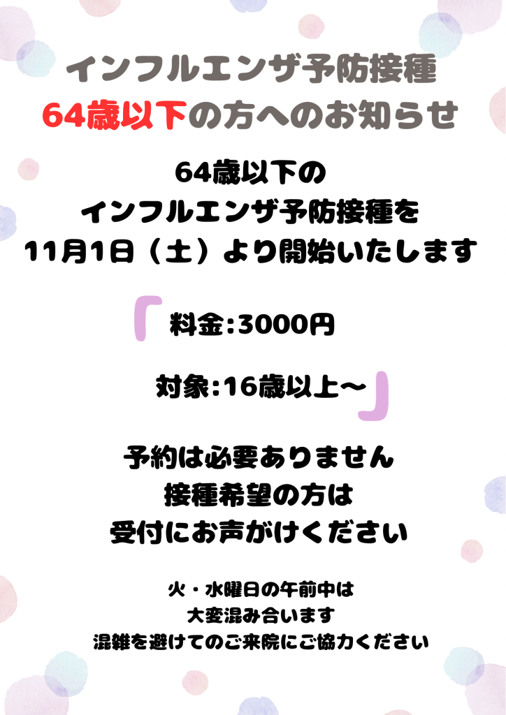 【渡辺医院】インフルエンザ予防接種についてのお知らせ(64歳以下の方)