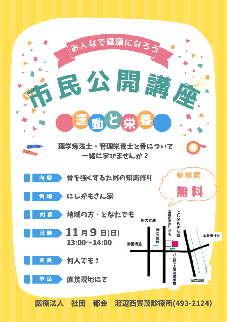 【市民公開講座】「運動と栄養」(R7.11.9) 2025年10月15日 2025年11月9日(日)13時から市民公開講座「運動と栄養」を開催いたします。 テーマは「骨を強くするための知識作り」どなた様でも参加いただけますので、是非とも、お誘いあわせの上お越しくださいませ。